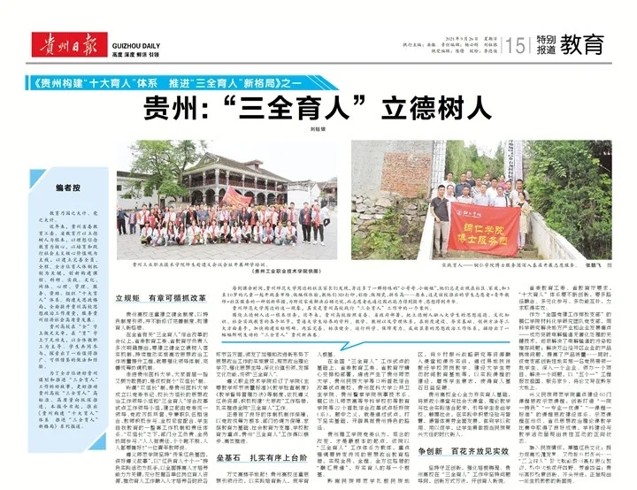 为了全方位讲好贵州谋划和推进“三全育人”工作的好故事,更好推动贵州高校“三全育人”高标准、高质量向纵深推进,本报今日起,推出《贵州构建“十大育人”体系 推进“三全育人”新格局》系列报道。