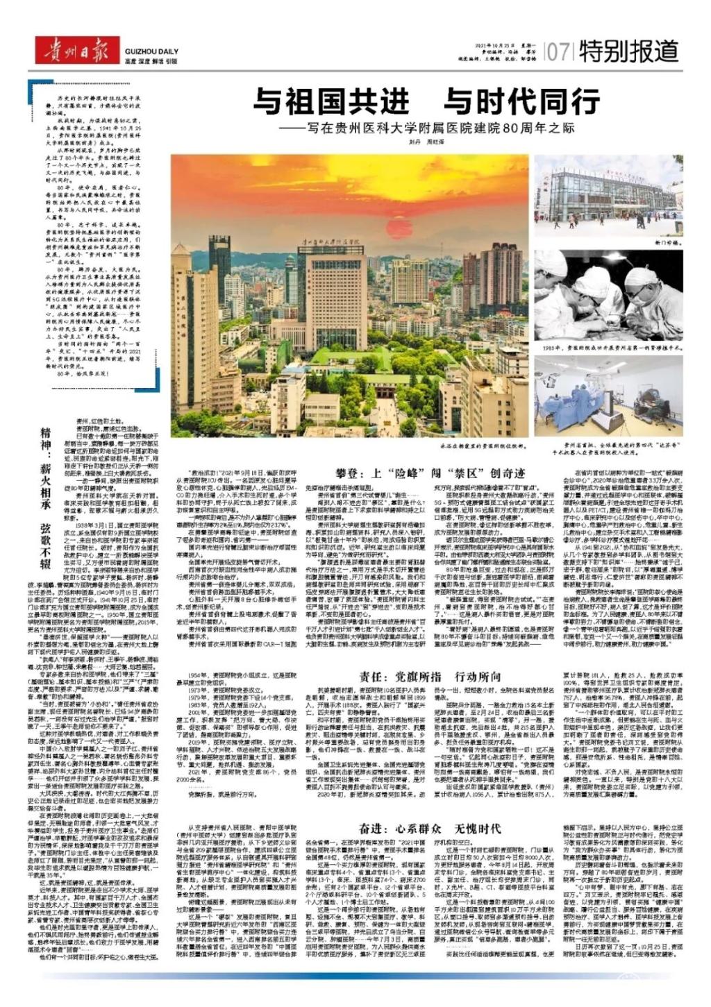 从支持贵州省人民医院、贵阳中医学院(贵州中医药大学)创建到派出多批医疗队到非洲几内亚开展医疗援助;从下乡送药义诊到与全省209家基层医院合作,建成四级公立医院远程医疗服务体系;从自制道具开展科研到强力推进“贵州省精准医学研究院”和“贵州省生物医学测序中心”一体化建设,构筑科技新高地;从缺乏专业医护人员到实施人才兴院、人才倍增计划,贵医附院高质量发展的图景愈发清晰。
