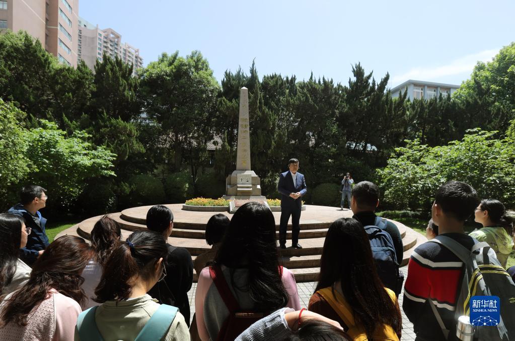 在上海交通大学校园里的史霄雯、穆汉祥烈士墓前,刘统教授在讲述两位烈士牺牲的历史经过(2019年5月7日摄)。新华社记者刘颖 摄