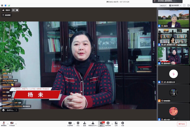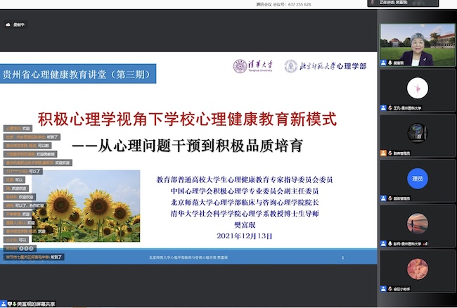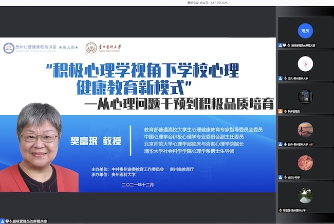 12月13日,第三期贵州心理健康教育讲堂在线举行。本期讲座由省委教育工委、省教育厅主办,awc777万象城娱乐官网承办。省委教育工委副书记(正厅级)、教育厅党组成员杨未同志出席并讲话,awc777万象城娱乐官网党委副书记汤磊同志出席并致辞,全国知名心理专家樊富珉教授为全省2000余名大中小学心理健康教育教师、高校辅导员、中小学班主任、心理健康教育工作管理人员作专题讲座。awc777万象城娱乐官网大学生心理咨询与教育中心副主任彭丹主持讲座。