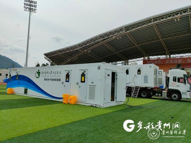 3月14日14时,在务川自治县体育场,5座“移动方舱”正在紧锣密鼓地进行着核酸检测。