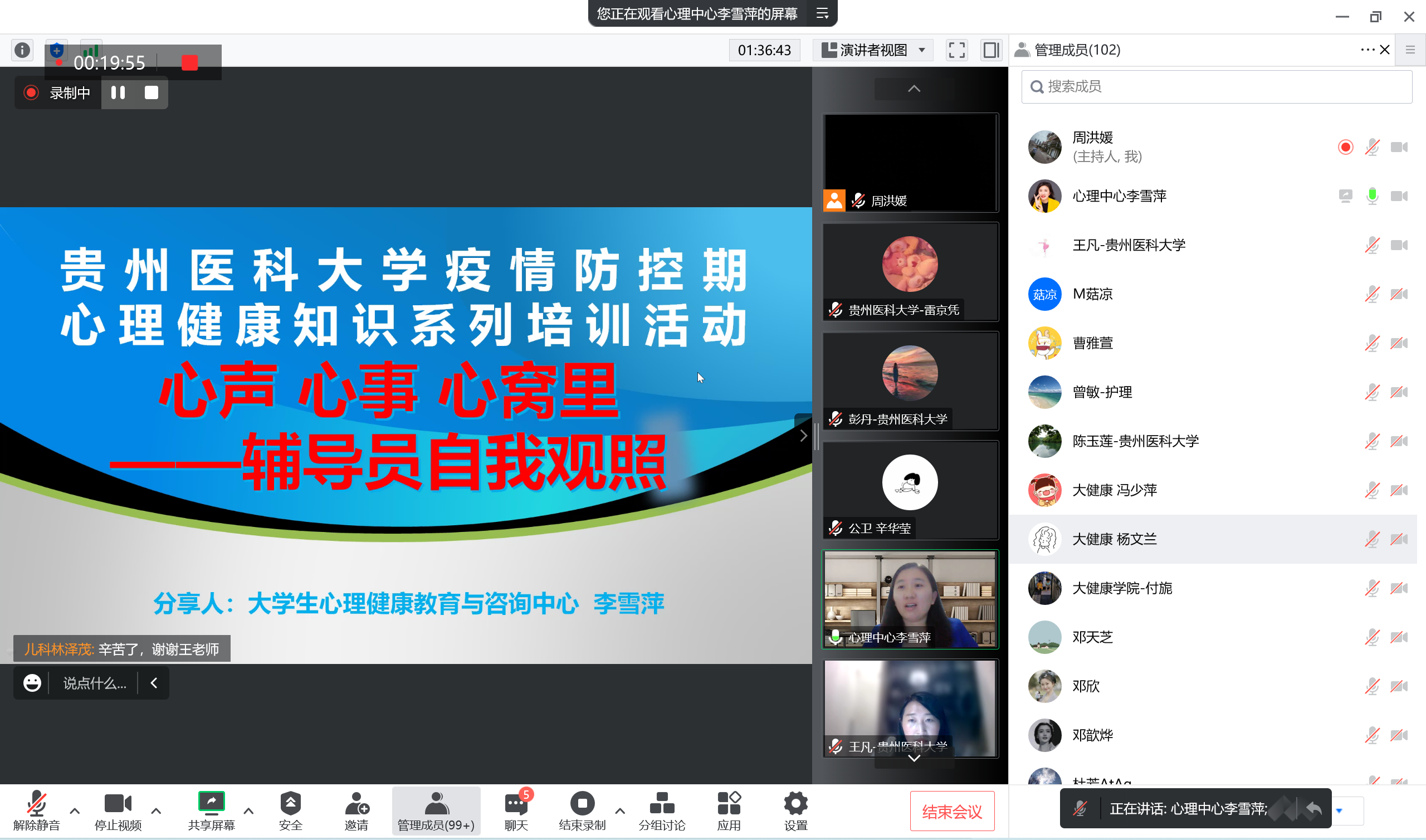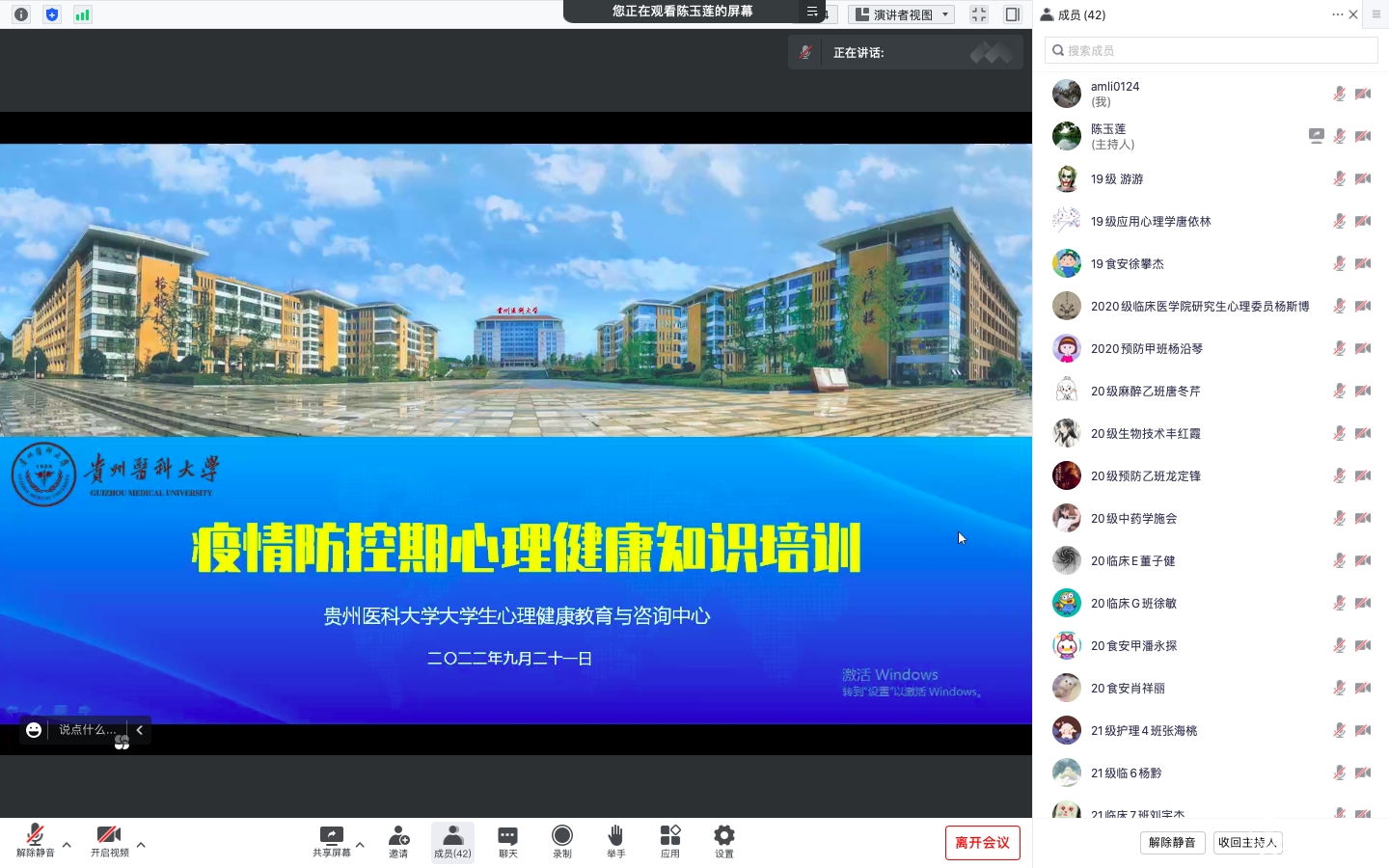 2020级临床检验诊断学硕士研究生心理委员谢璐鸿:本次学习培训,我学到疫情期间可能出现的心理反应,作为心理委员,在做好自我心理健康维护的同时,要协助辅导员老师做好班级同学们的心理健康工作,在疫情防控期间,要学会正视并接纳负面情绪、采取适当的方法调整负性情绪。