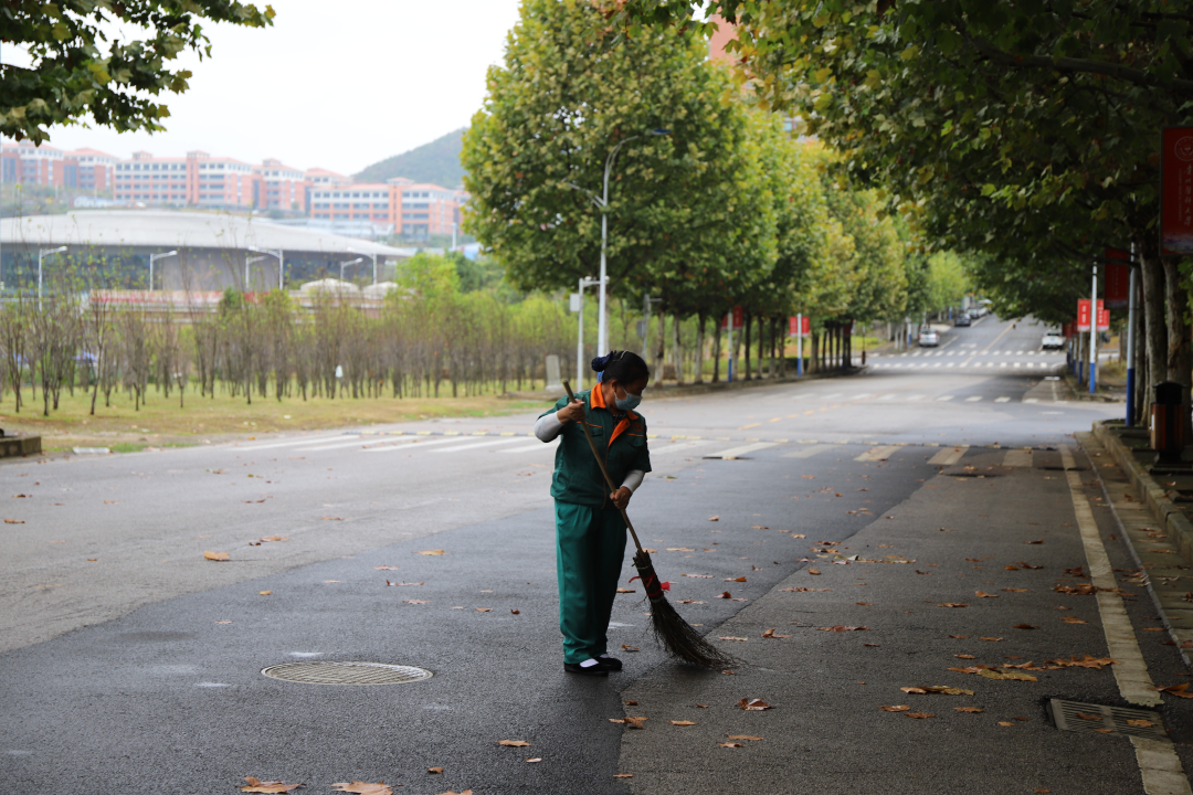 疫情突袭,全员防控。寂静无人的校道上洒满了落叶,身着工作服的环卫阿姨戴着口罩在为我们保持着校园的干净整洁。我们不止需要记住大白、大蓝,也要记住那些默默付出的人。