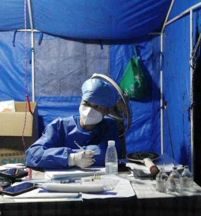 消毒、采样、消毒……一遍又一遍,不厌其烦地重复着相同的工作。严密的防护服包裹得密不透风,干渴着嗓子还在不停的工作。大白与救护车不灭的灯光,是这疫情里的烛光,给我们带来源源不断的力量。