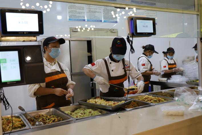 一个个打包盒,一勺勺菜肴,食堂阿姨戴着口罩,熟练地装进饭盒,一整天都在为我们的一日三餐忙碌着。疫情之下,她们对我们的关爱伴随着一份份盒饭送到手里。