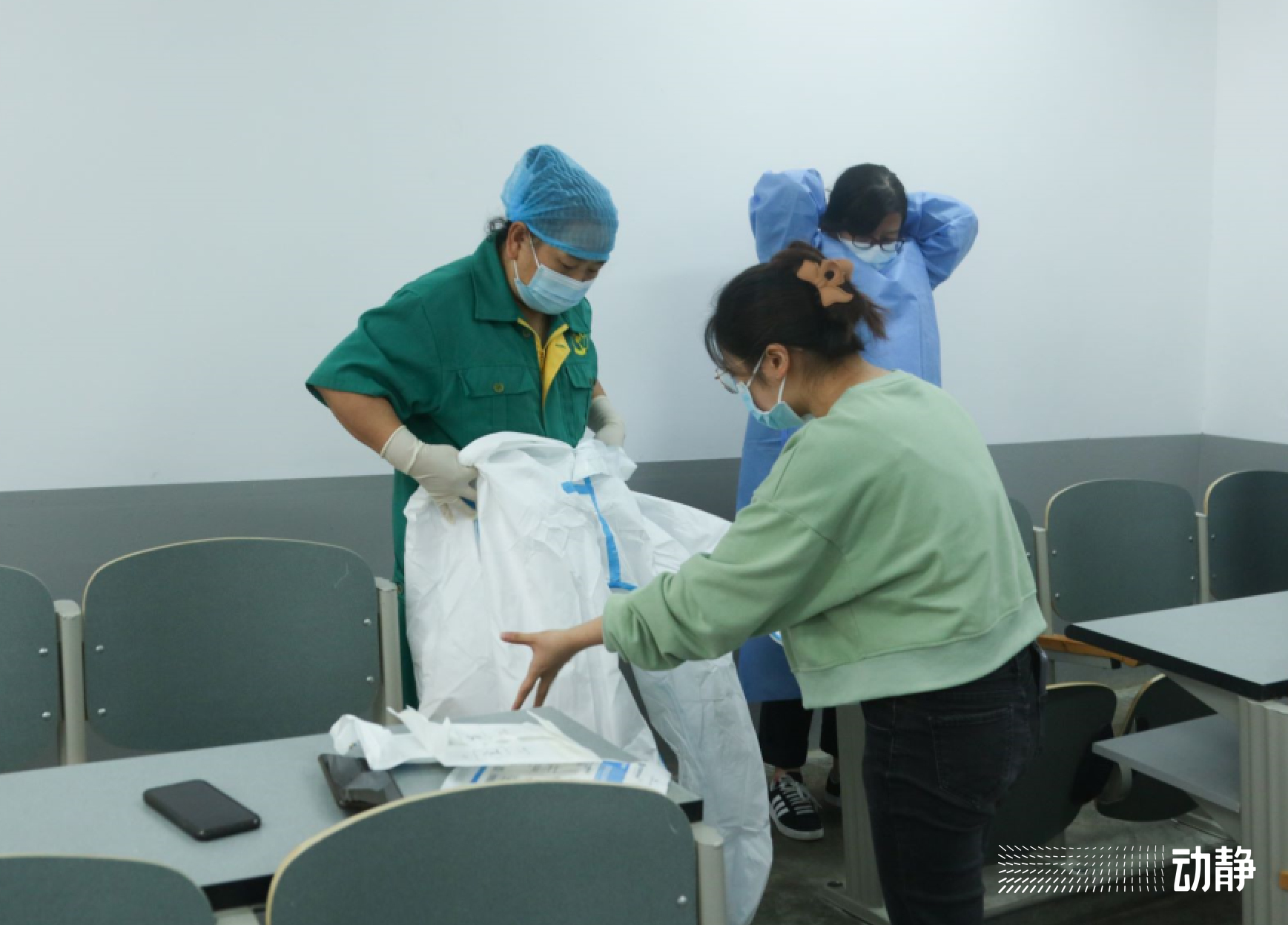 “现在,请解开防护服拉链口,脱去防护帽,防护服内面朝外、从上至下轻轻卷至小腿部,连同靴套卷至脚踝部,外层手套在脱下防护服时一并脱下,将防护服及外层手套同时放于垃圾桶内”。