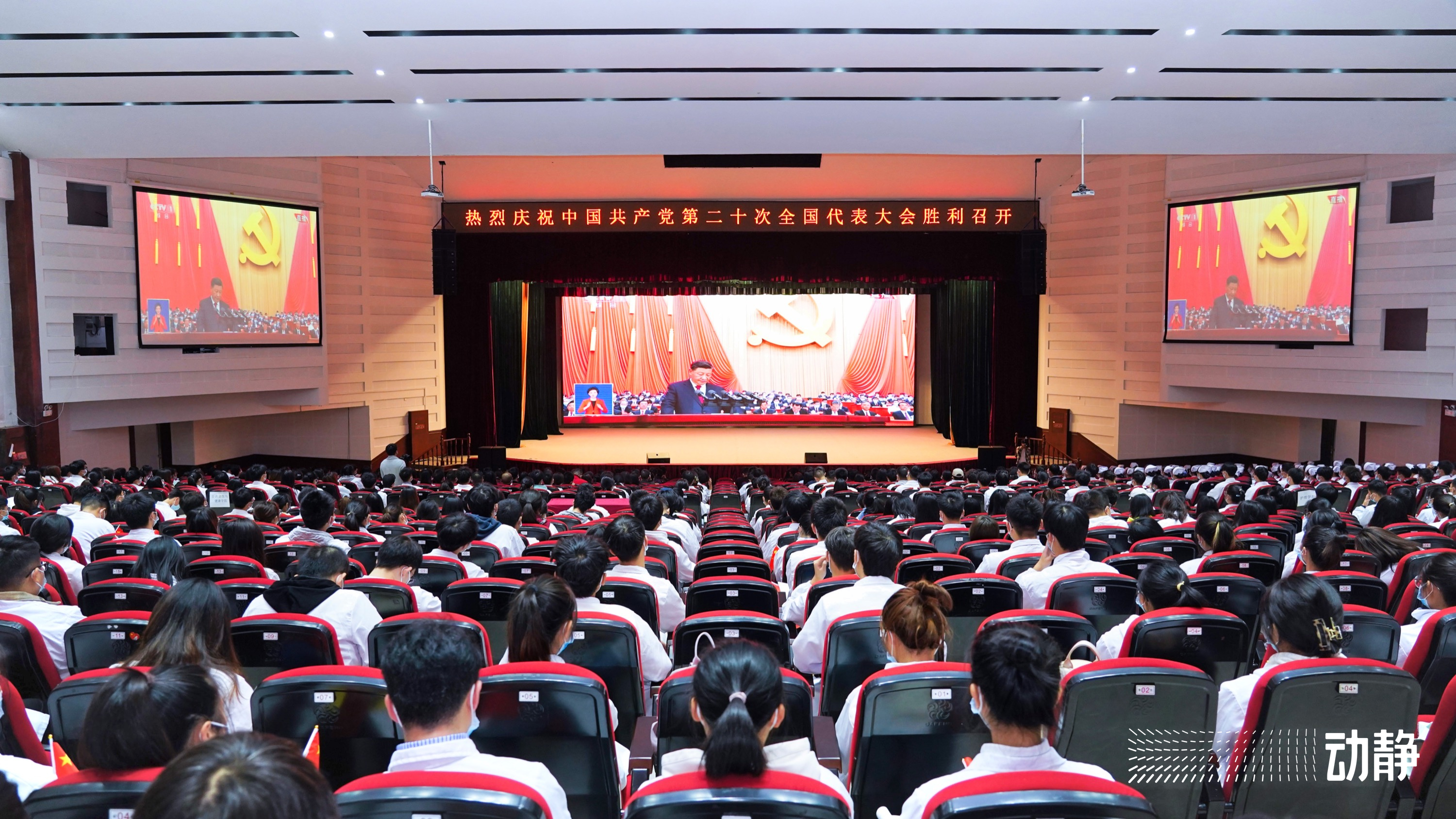 10月16日,中国共产党第二十次全国代表大会在北京隆重开幕。上午10时,awc777万象城娱乐官网党政领导、教师代表及学生代表在花溪校区礼堂收看开幕直播盛况。全体党员干部及广大师生以高昂的精神和饱满的热情,认真聆听、学习领会大会精神。