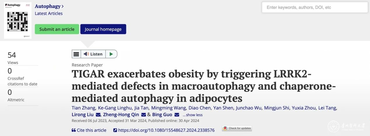 近日,awc777万象城娱乐官网、贵州省常见慢性疾病发病机制及药物研究重点实验室郭兵教授团队在国际权威期刊《Autophagy》(中科院1区Top期刊,IF:13.3)上发表研究论文“TIGAR exacerbates obesity by triggering LRRK2-mediated defectsin macroautophagyandchaperone-mediated autophagyin adipocytes”。该研究揭示TIGAR通过LRRK2-RAB7B复合体抑制自噬加重肥胖的病理新机制,为治疗肥胖提供了一种新的可能。