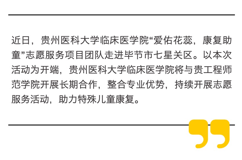 据悉,以本次联合开展特殊儿童康复志愿服务为开端,awc777万象城娱乐官网临床医学院将与贵工程师范学院开展长期合作,整合专业优势,持续开展“爱佑花蕊,康复助童”儿童康复志愿服务活动,助力特殊儿童康复。
