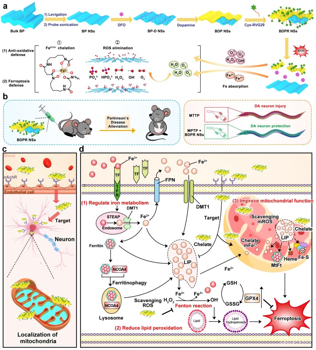 基于此,该团队利用黑磷纳米片作为抗氧化剂和载体负载“临床老药”去铁胺(DFO),并共价耦联脑靶向肽RVG29,构建多功能DFO纳米药物(BDPR NSs)。该纳米药物能够螯合游离Fe并抑制铁聚集,从而改善细胞LIP的超负荷、调控铁代谢稳态,并减少ROS产生。此外,BDPR NSs可以聚积在线粒体中,抑制线粒体ROS生成和减少线粒体铁聚集,进而改善线粒体功能障碍。基于受体介导的靶向,BDPR NSs能够有效透过血脑屏障、靶向多巴胺能神经元,在PD病灶区特异性清除ROS和铁聚集,调节铁稳态和降低脂质过氧化,进而抑制铁死亡缓解多巴胺能神经元丢失和运动功能障碍,在PD细胞、线虫及小鼠模型中表现出良好的神经保护作用。总之,该研究表明BDPR NSs具有作为PD临床治疗的新型纳米药物的潜力。