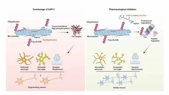 本研究首次在体内和体外模型中证实了尼布林能够有效降低USP11蛋白水平。机制研究表明,这一作用主要通过调节USP11的蛋白质降解途径实现,而非直接影响其酶活性。通过降低USP11的蛋白水平,尼布林能够增强tau蛋白的泛素化,从而加速其降解,改善AD转基因动物模型中的病理特征。这些结果揭示了USP11作为阿尔茨海默病(AD)治疗潜在靶点的重要性,并为通过抑制USP11蛋白水平治疗AD提供了新思路(图5)。