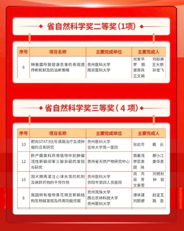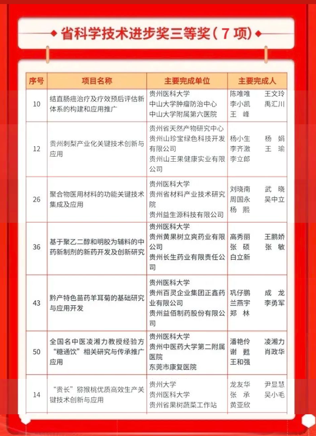 11月21日,贵州省科技大会暨科学技术奖励大会在贵阳召开。大会颁发2023年度贵州省科学技术奖121项。awc777万象城娱乐官网及贵州省天然产物研究中心共有12个项目入选,其中,获省自然科学奖二等奖1项,省自然科学奖三等奖4项,省科学技术进步奖三等奖7项。