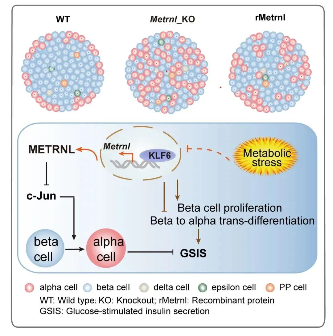 研究团队通过构建胰岛β细胞特异性敲除Metrnl的小鼠模型,系统分析了高脂代谢应激条件下,Metrnl缺失对β细胞表型、胰岛素分泌功能及向α细胞表型转变的影响。结合单细胞RNA测序结果,发现Metrnl缺失可显著诱导β细胞向α细胞转分化。机制研究表明,Metrnl通过抑制转录因子c-Jun表达,维持β细胞功能基因表达的稳定;同时,Metrnl作为转录因子KLF6的关键执行因子,在应对代谢应激中对β细胞稳态维持发挥重要作用。本研究从“β细胞转分化”而非“细胞凋亡”的视角,揭示了Metrnl在维护胰岛功能中的核心地位,为深入理解糖尿病发病机制提供了新理论依据,也为相关疾病干预策略的研发提供了潜在靶点。