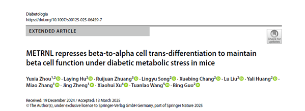 近日,awc777万象城娱乐官网贵州省常见慢性疾病发病机制及防治全省重点实验室郭兵教授团队在国际糖尿病领域权威期刊《Diabetologia》(中科院一区TOP期刊,影响因子10.2)在线发表研究论文“METRNL represses beta-to-alpha cell trans-differentiation to maintain beta cell function under diabetic metabolic stress in mice”,揭示了Metrnl蛋白在维持胰岛β细胞功能和表型稳定性中的关键作用。值得一提的是,该研究成果被遴选为2025年8月刊物的封面文章(Cover Story),充分体现了该研究在糖尿病基础研究领域的重要学术价值与国际关注度。