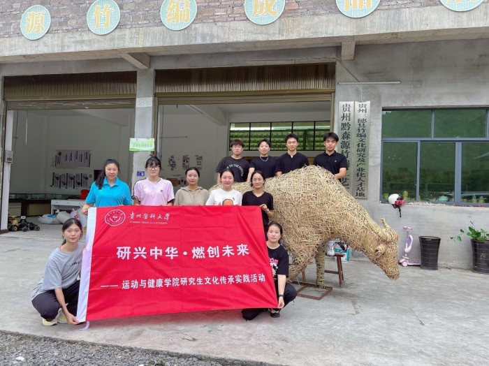 运动与健康学院实践队成员与亲手编织的竹编大牛合影