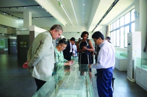 外国友人在贵州财经大学票据博物馆参观丰富的票据藏品。