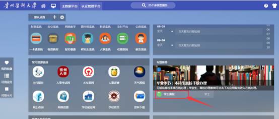 3、 一般在毕业季节到来时,桌面上有毕业季节的专题推荐,如下图,点击下面的 【学生离校】即可进入离校服务应用。