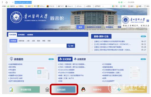 (1)进入图书馆主页网址(http://lib.gmc.edu.cn/),在网站最下方点击“校外访问”按钮。