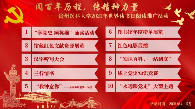 2021年是中国共产党成立100周年,是“十四五”开局之年,也是“两个100年”奋斗目标的历史交汇点。第十三届全国人大四次会议批准《中华人民共和国国民经济和社会发展第十四个五年规划和2035年远景目标纲要》,其中,“提升公共文化服务水平”一章中专门提出了“深入推荐全民阅读,建设书香中国'”。在2021年4月23日世界读书日来临之际,为深入贯彻习近平总书记在党史学习教育动员大会上的重要讲话精神和视察贵州重要讲话精神,积极响应中共贵州省委党史学习教育领导小组关于“高标准高质量开展好党史学习教育”的部署和要求,万象城官网拟通过阅读推广活动推进书香校园建设,并且在活动中融入省委教育工委省教育厅贵州高校“学党史颂英雄”百场诵读活动,以推动校园文明建设。