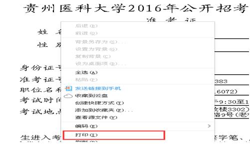 3)进入“打印报名表”或“打印准考证”页面后,右击鼠标选择“打印”即可。