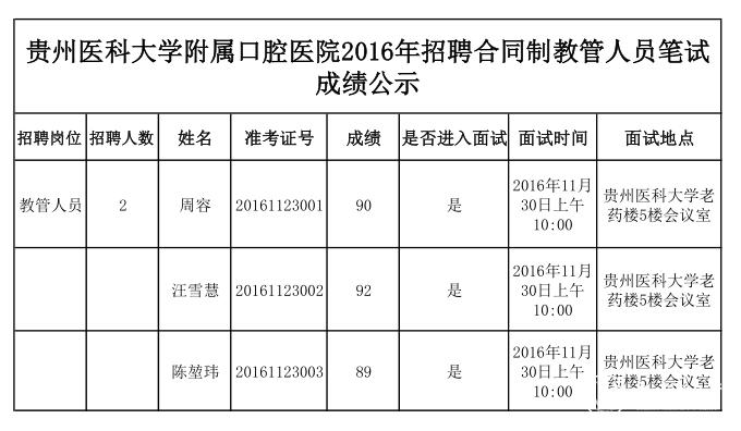 awc777万象城娱乐官网附属口腔医院2016年招聘合同制教管人员笔试已结束,共3人进入面试,现拟将笔试成绩予以公示。