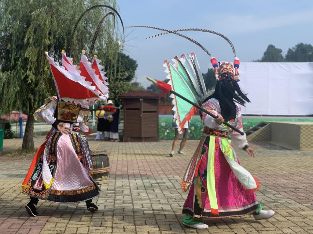 舞台上,地戏演员们身着色彩斑斓的戏服,头戴雕刻精细、表情各异的面具,仿佛从古代走来的勇士,瞬间将留学生们带入了一个神秘而古老的世界。随着锣鼓声的响起,地戏表演正式开始,演员们以矫健的身姿、高亢的唱腔,演绎着一个个关于英雄、忠诚与正义的故事。他们的每一个动作都充满了力量与美感,每一个眼神都透露出角色的情感与性格,让留学生们为之震撼。