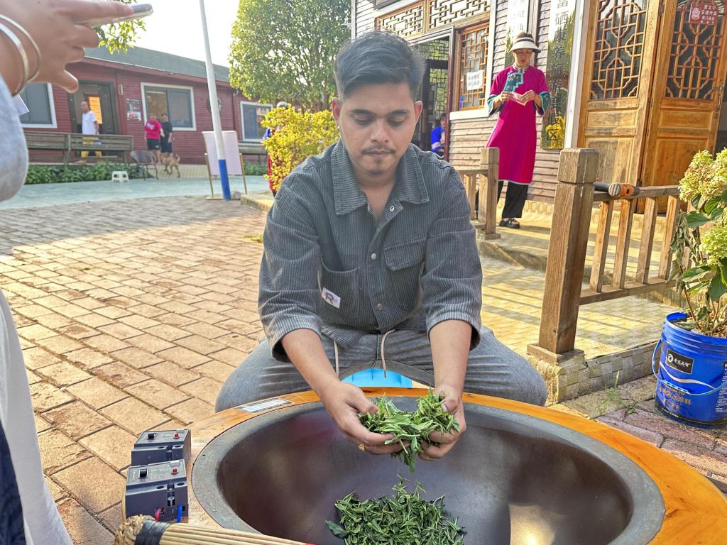 随后,留学生们踏入了绿意盎然的茶山,开启了一场关于茶叶的探秘之旅。在茶农的带领下,他们穿梭于茶树之间,亲手采摘下嫩绿的茶芽,体验着劳动的乐趣与自然的馈赠。接着,他们走进炒茶房,亲眼见证了茶叶从鲜叶到成品的神奇变化。在炒茶师傅的指导下,留学生们亲自动手翻炒茶叶,感受着茶叶在高温下逐渐散发出的清香,最终制作出属于自己的茶叶,那份成就感与喜悦难以言表。