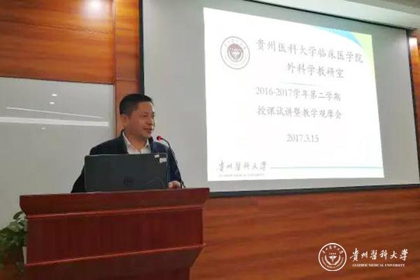 为规范教学工作、提高教学质量、加强师资队伍建设、提高教师授课水平,临床医学院外科学教研室根据临床教学规范,本着“开新课、新开课”都要试讲的原则,3月15日在临床技能中心208会议室举行“2016-2017学年第二学期授课试讲暨教学观摩会”。贵医附属医院副院长、临床医学院常务副院长孙发,临床医学院党委书记周红,学校教学督导组专家李家富教授、陈绪光教授、王艳芳教授、刘焱教授、外科学教研室部分科主任、教学组长、专职教学老师、总住院医师等约50人参加。会议由外科学教研室本科教学负责人尹朝晖主持。