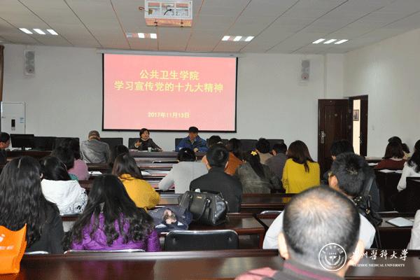 11月14日,公共卫生学院在博雅楼二楼学习报告厅召开全体教职工大会,开展党的十九大精神专题学习,学习由公共卫生学院党委书记杨光红主持。