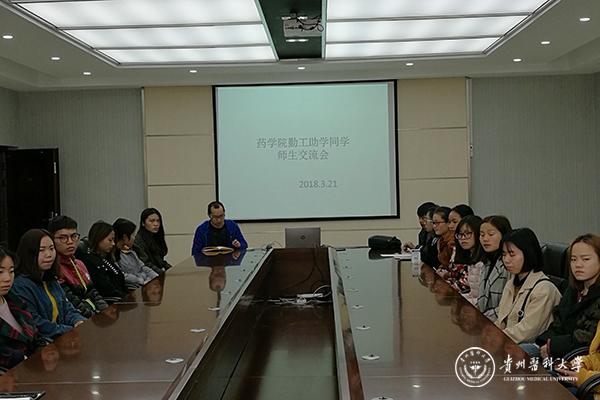 3月21日,药学院助学工作交流会在格物楼六楼会议室召开。药学院党委副书记廖兴江、学院关心下一代工作委员会成员黄静、张敏等及参与勤工俭学的同学30余人参加会议。