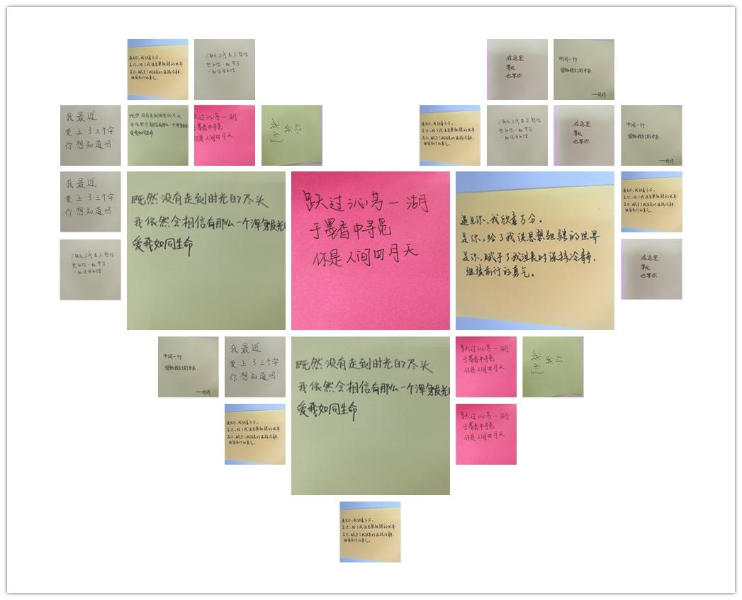 三行情书活动目的是促进大学生的情感交流与表达,分享自己与图书馆的故事。截止到26日,活动共收集到微信留言情书、现场书写情书共四十多封,字里行间全是同学们对图书馆或者某一本图书的喜爱。