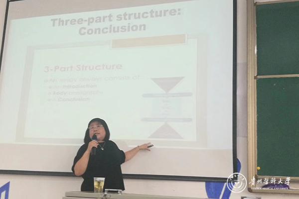 吴若芬博士在美国华盛顿州立大学获得英语写作教学博士学位,主要从事“叙事写作”和“非英语母语学生学习英语的问题”研究,并在国际重要期刊发表多篇论文。吴若芬博士此次和其先生、来自美国Western Michigan University、从事医学信息学研究的韩子义(博士)教授应awc777万象城娱乐官网国际交流处邀请来万象城官网从事为期一个月的讲学和交流。吴若芬介绍学术英语写作从语篇布局、语言运用和规范引用等知识。