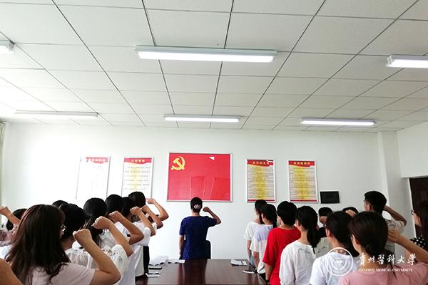 杨英代表学院党委向全体新党员表示诚挚的祝贺,新党员的加入为党组织增添了新的活力,为党的建设注入新的血液。在杨英的带领下,全体预备党员起立致敬,面对党旗,紧握右拳,庄严宣誓。16级预备党员何欢代表全体新党员向党组织表决心,要在政治思想、作风纪律、工作学习上不断完善自己,以“不忘初心,继续前进”的箴言鞭策自我,以实际行动践行党员要求。