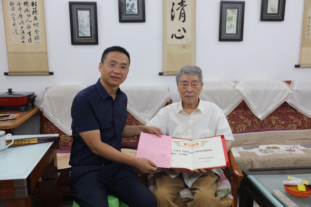 7月30日,1942级校友、著名外科专家、贵医附属医院大外科原副主任、烧伤外科原主任刘伍生教授捐赠了国立贵阳医学院时期用的《病理学》英文版教材一本、英文便条一张及《实验诊断学》英文版教材一本,党委宣传部部长杨毅接受捐赠,并向刘伍生教授颁发了捐赠证书和感谢信。离退休处处长仇春鸣、运动与健康学院党委书记姚思勤、党委宣传部副部长吴祥文及相关人员参加。