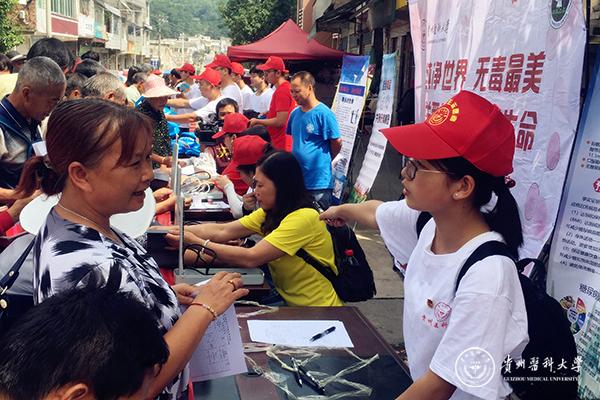 24日上午志愿队到达黔西县铁石乡,在乡政府及团委的大力协助下,开展“同在一个世界 同禁万恶毒源 同享光明人生”禁毒知识及学生资助政策宣传活动。为村民发放印制宣传禁毒知识的小扇子、气球、购物袋及纸巾盒的同时开展禁毒知识问答抽奖活动,并且就国家及学校相关的资助政策,鼓励乡村贫困家庭支持子女接受更高层次教育。志愿队还对乡民进行义务诊疗,为乡民进行视力、色觉检查,血压、血糖测量,地区常见病、多发病的问诊解答等,为助力“健康贵州”社会公益做出贡献,产生了良好的社会影响。