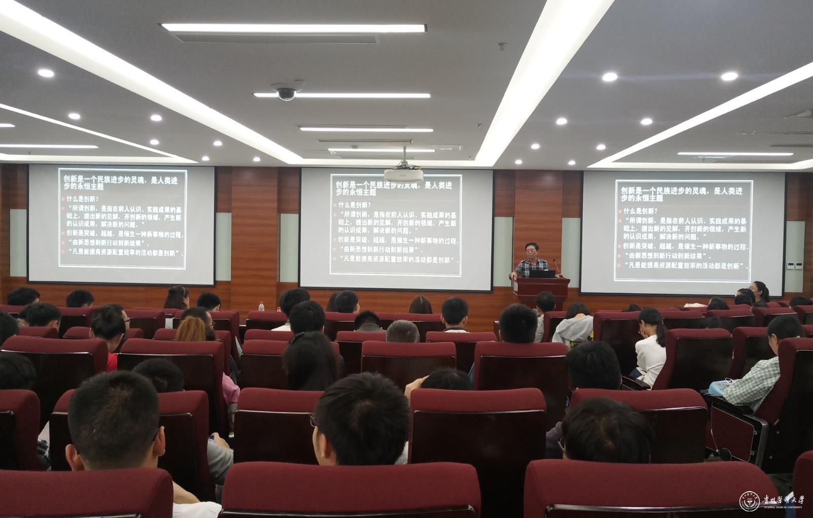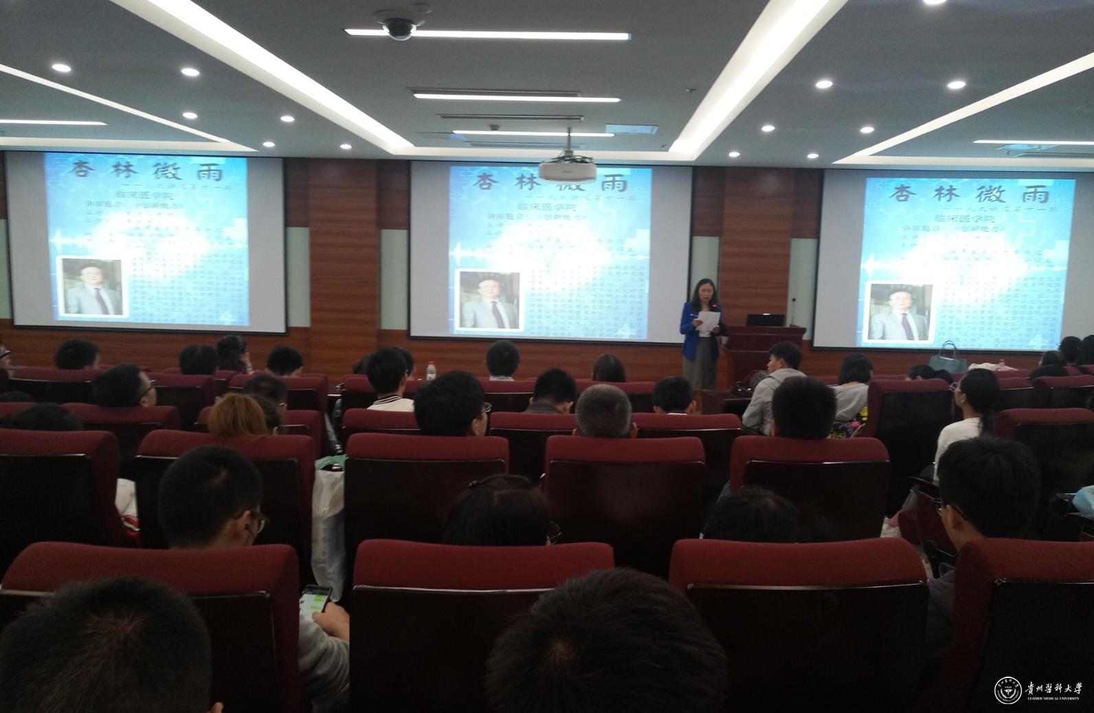 9月13日,临床医学院举办“杏林微雨”人文讲座第十一期,贵州省社会科学院历史研究所原所长,贵州文史研究馆馆员,中国史学会第七、八、九届理事,贵州省史学会第四、五、六届会长,贵州省首批省管专家、全国优秀社会科学普及专家,贵州省委决策咨询专家、多彩贵州文化旅游研究院院长熊宗仁教授应邀在北京路校区临床技能中心二楼会议室为师生作《创新能力》专题讲座,讲座由临床医学院党委书记周红主持。临床医学院党委副书记杨婕,学生科负责人,2015级辅导员、班主任及学生二百余人参加讲座。