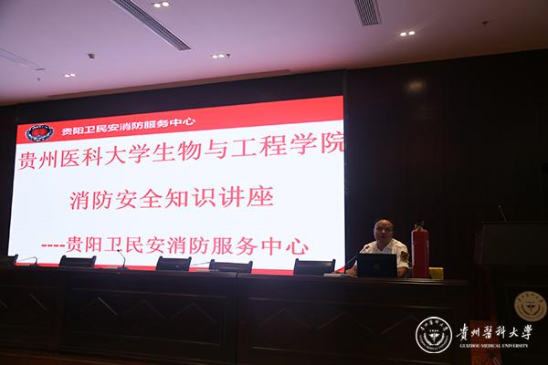 为了提升我院师生的消防安全意识,增强面临火灾时减灾、救灾能力,9月28日生物与工程学院在南校区道德讲堂组织开展消防安全培训,本次培训邀请贵阳市卫民安消防宣传服务中心吴德亮教官主讲,校保卫处领导、学院全体教职工出席培训会,2018级全体本科生及研究生参加了本次培训。培训会由生物与工程学院党委书记封韬主持。