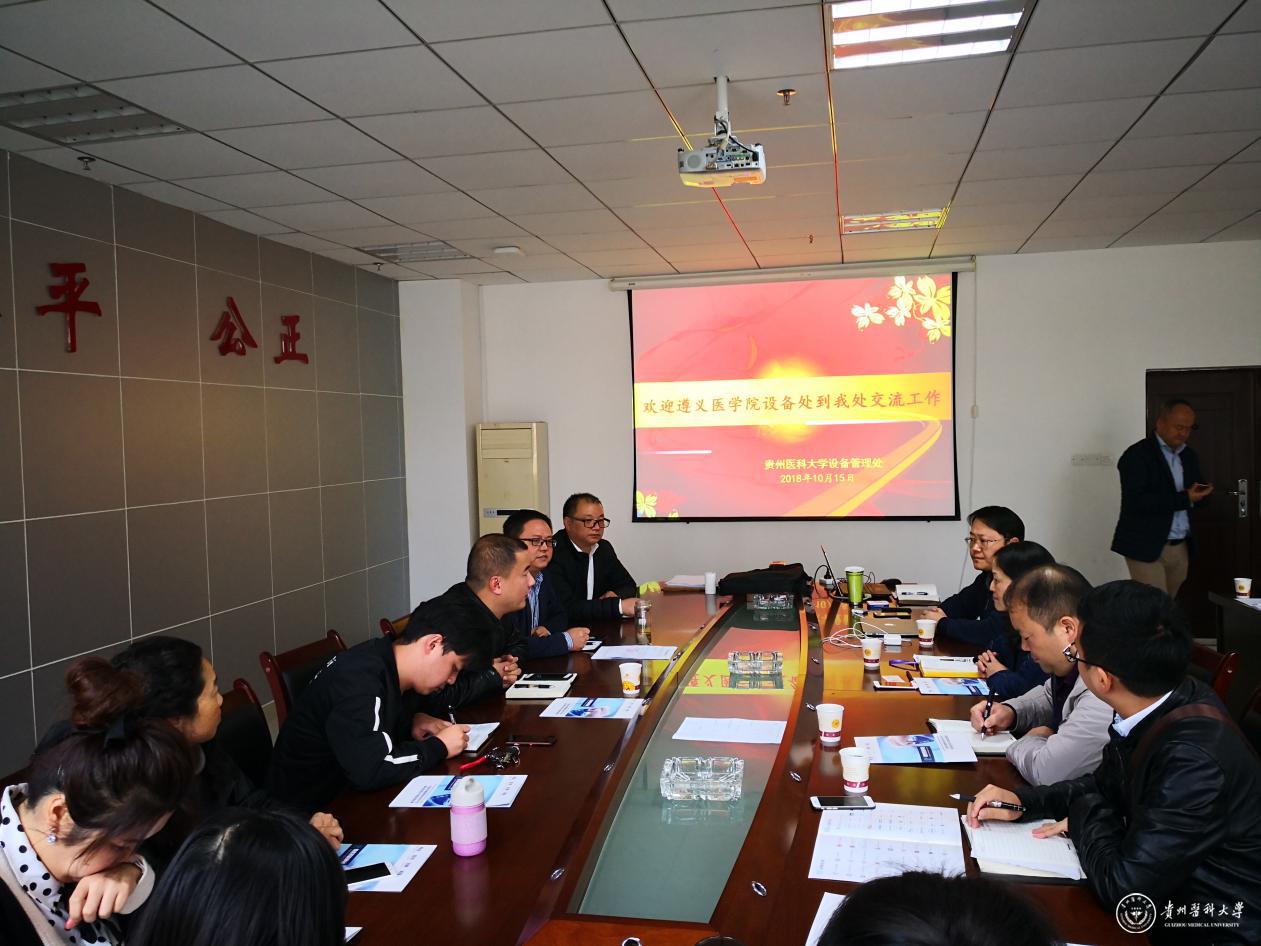 10月15日,遵义医学院设备处处长蒋熠一行4人,到万象城官网设备管理处考察交流。交流座谈会在南校区颂雅楼3楼会议室举行,设备管理处处长高鸿、副处长王欢及设备管理处全体工作人员参会。会议由高鸿主持。