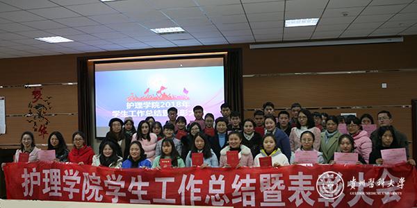 12月17日,护理学院在南校区百川楼1101教室召开2018年学生工作总结暨表彰大会。护理学院党委副书记杨英、教学科研管理科科长王秀红、全体辅导员、部分班主任、全体学生会成员及部分学生代表参加,会议由护理学院学生管理科科长曾敏主持。