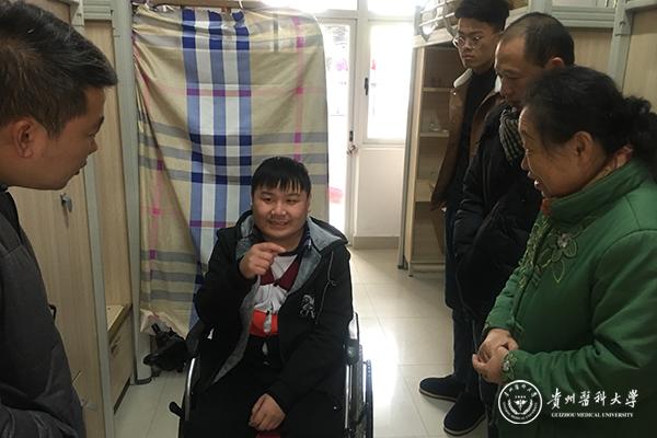 12月18日,学校关心下一代工作委员会副主任张锦明,离退休工作处副处长周辉、离退休工作处退休科科长杨惠在医学人文学院党委副书记张健及2018级辅导员陪同下,前往花溪校区4栋宿舍楼慰问医学人文学院2018级应用心理学张兵兵同学。