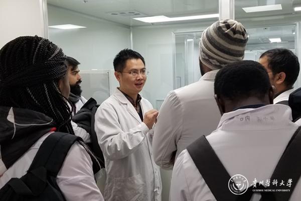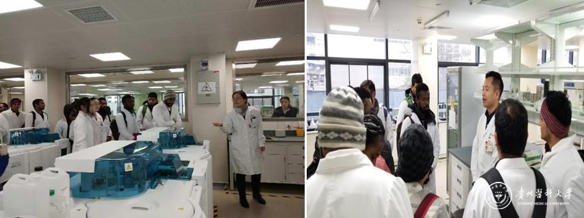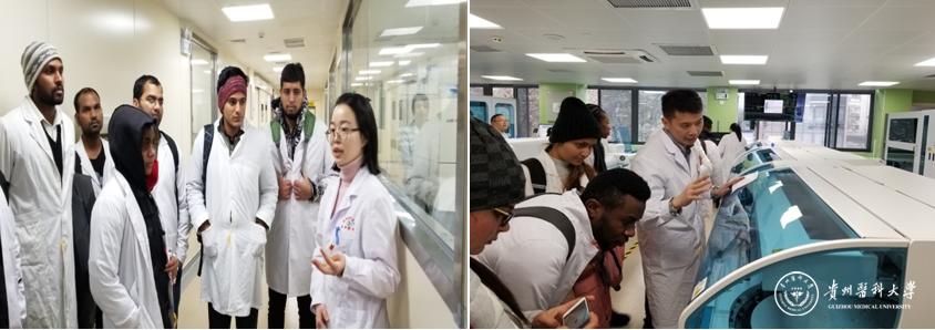 医学检验学院院长黄海介绍了临床检验中心的总体概况、临床检验的工作范畴以及分子生物学实验室的布局及分子生物学检验的发展现况。留学生分组到各实验室进行参观学习,专业老师就实验室的基本情况、项目内容、仪器设备等进行了详细讲解。其中,陈瑜、胡智成、赵佩玲、韦四喜分别介绍了临床检验实验室的项目内容和实验室基本情况;微生物实验室的工作流程和主要仪器设备;流式细胞实验室的流式检测原理和临床应用;生化实验室的全自动流水线及其工作情况;余芳带领留学生们参观了免疫实验室的流水线设备并介绍了临床免疫学检查在临床工作中的重要性。老师全程用英语讲解并回答留学生提问,参观的留学生也被实验室的检验工作和先进的仪器设备所吸引,产生了浓厚的兴趣,积极与老师交流讨论。