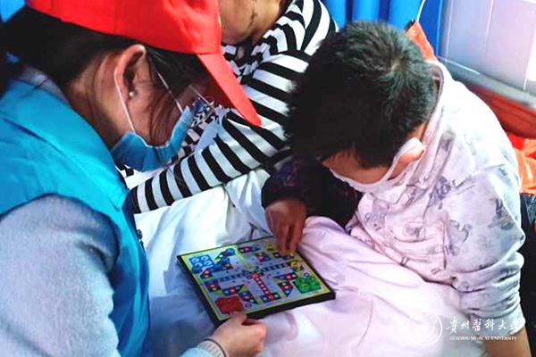 志愿者为小朋友准备了各种儿童书籍,玩具,文娱用品等。在病房里,志愿者和小朋友做游戏、陪伴他们做作业,认真倾听他们的故事,使孩子们感受到了哥哥姐姐的关怀和社会的温暖。在和小朋友互动过程中,志愿者通过各种方式为生病的小朋友加油打气、鼓励他们克服困难,勇敢战胜病痛。在与家长的亲切交流中,同学们利用自己所学专业知识帮助父母分析孩子的病情,使他们更加坚定信心,乐观面对孩子的病情。