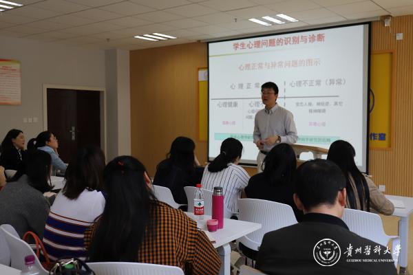 4月9日,学工部在“杏林医语”辅导员工作室织开展《校园心理危机的识别与应对》专题培训,学工部全体人员及辅导员参加培训。贵州师范大学心理学副教授程刚博士应邀为大家开展培训。培训由学工部部长赵平主持。