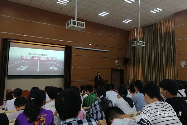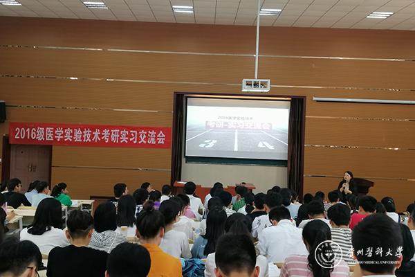 为加强学生对专业前景的了解,增强专业信心,提高学习积极性。4月24日,基础医学院在厚德楼101教室召开学生考研实习交流会,基础医学院党委副书记王妤煜、教管科董宇华、辅导员陈培各及2015级、2016级、2018级医学实验技术学生参加交流会。