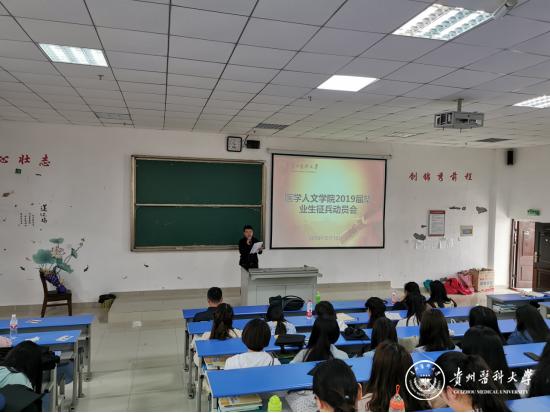为进一步推进学院2019年征兵宣传工作,5月13日,医学人文学院在广德楼1604教室召开2019届毕业生征兵工作动员会,医学人文学院党委副书记张健,分团委书记马曾珍,辅导员黄洋,医学人文学院2019届全体毕业生和2016级法学班全体学生参加动员会。辅导员黄洋主持会议。
