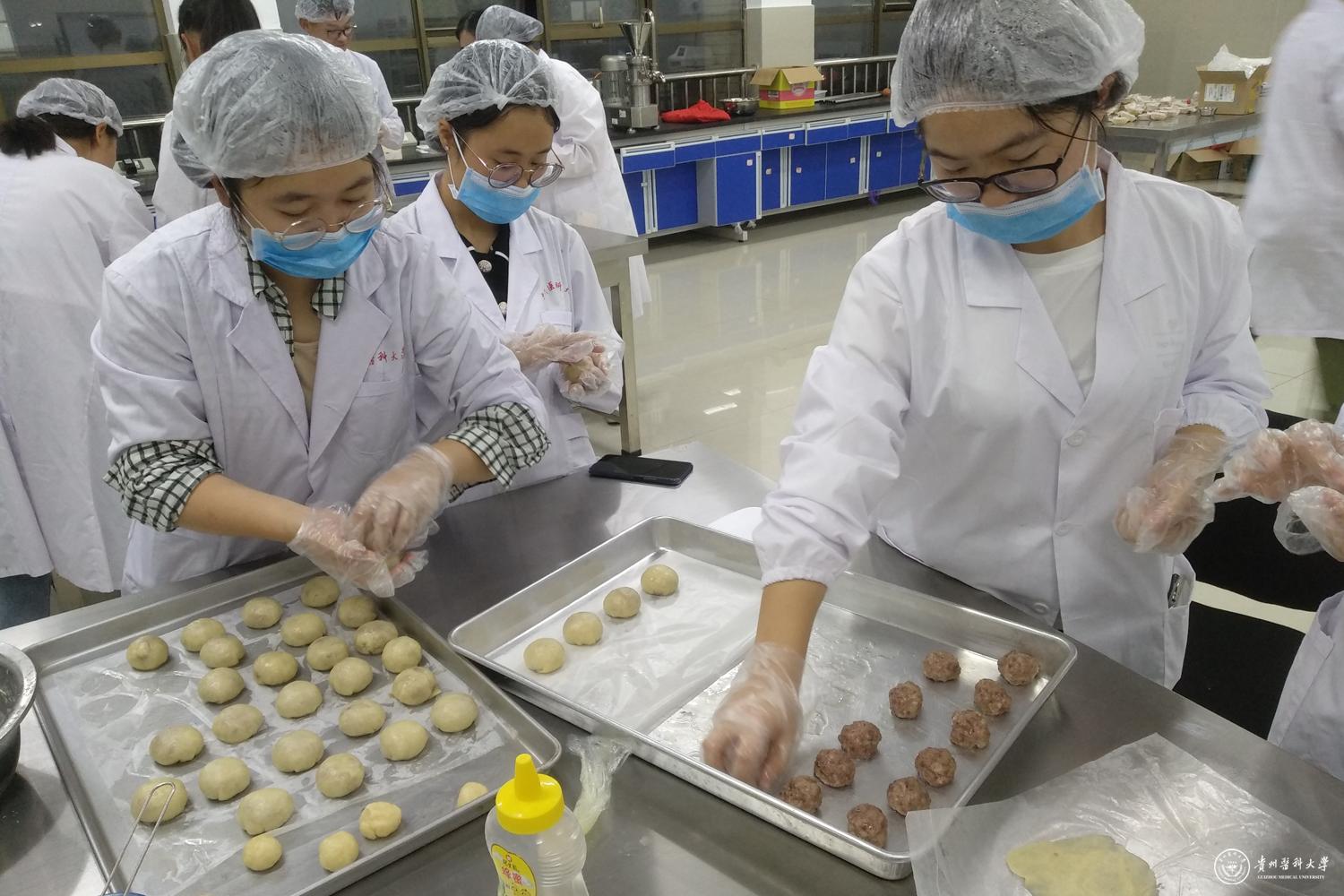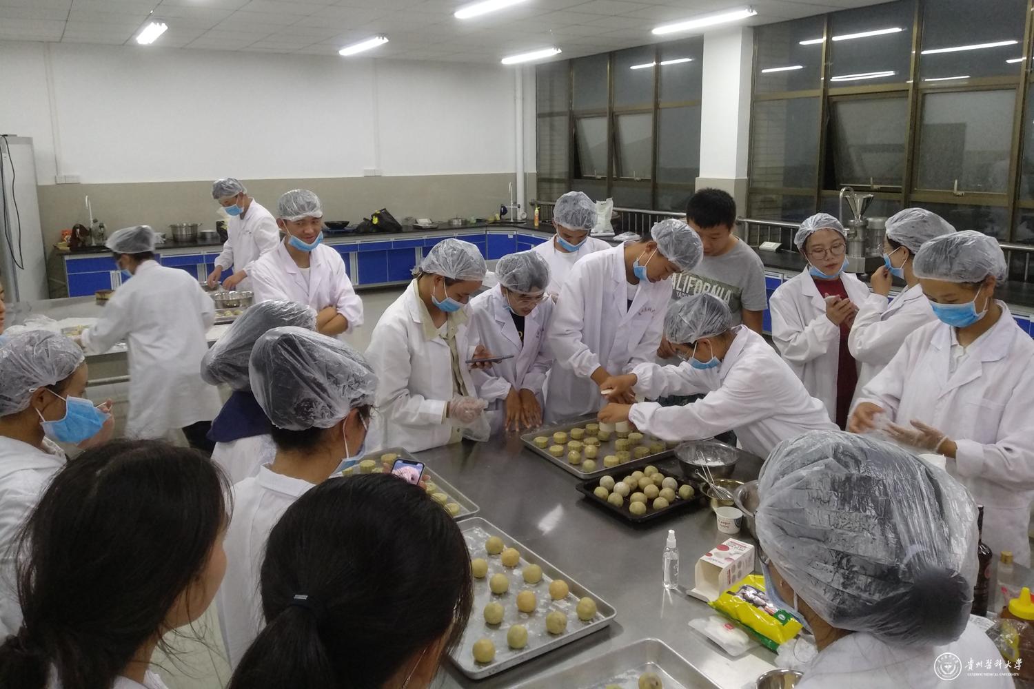 学院党政领导高度重视,针对学院专业特色精心设计了活动方案。团委将教职工和学生志愿者进行了分组,专业课教师提前对同学们做了馅料配方比例、加工注意事项等内容的理论讲解和专题指导。本次制作的月饼有蛋黄莲蓉、蛋黄凤梨、蛋黄紫薯和云腿四种口味。