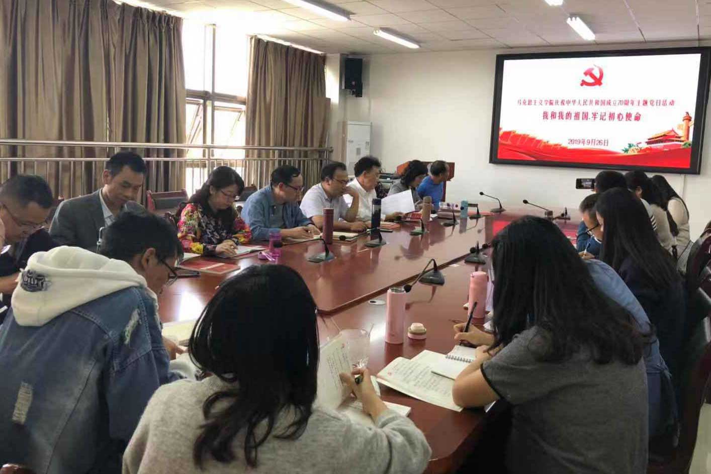 9月26日,马克思主义学院党委组织教工第一党支部和第二党支部无教学任务的教师党员在学院会议室、党员活动室举行以“我和我的祖国•牢记初心使命”为主题的主题党日活动,活动由副院长王万江主持,共计22名教师党员参加。