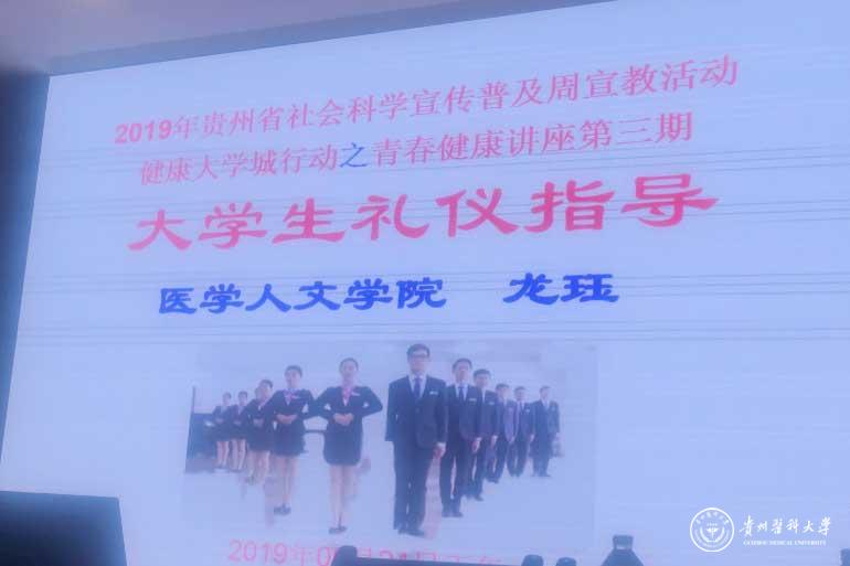 为庆祝新中国成立70周年和贯彻贵州省社科联《关于开展2019年贵州省社会科学宣传普及周活动的通知》精神,搞好社会科学宣传普及活动,积极开展“健康大学城”行动,提高大学生人文素养,培养知礼节、懂礼貌、有涵养、有修为、有魅力的大学生,9月24日,万象城官网在南校区道德讲堂举办了题为《大学生礼仪指导》的礼貌礼仪宣讲活动。讲座由大健康学院院长陈玉其主持,医学人文学院讲师、国家注册礼仪培训师(高级)、中国校园礼仪培训师龙珏主讲,全校300多名学生参加。