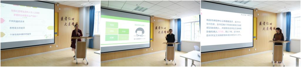 辅导员第四期“梦醒十分”宣讲试讲。食品科学学院辅导员周玄、基础医学院辅导员孙晓宇、法医学院辅导员郑艳华三位老师,依次以“换位思考 律己宽人”“我的未来不是梦”“校园是艾滋病的重灾区”为主题,结合理论和现实,运用案例和数据进行了精彩的宣讲展示,参会的辅导员分组对上述老师的宣讲逐一发表意见,提出了中肯的修改建议。