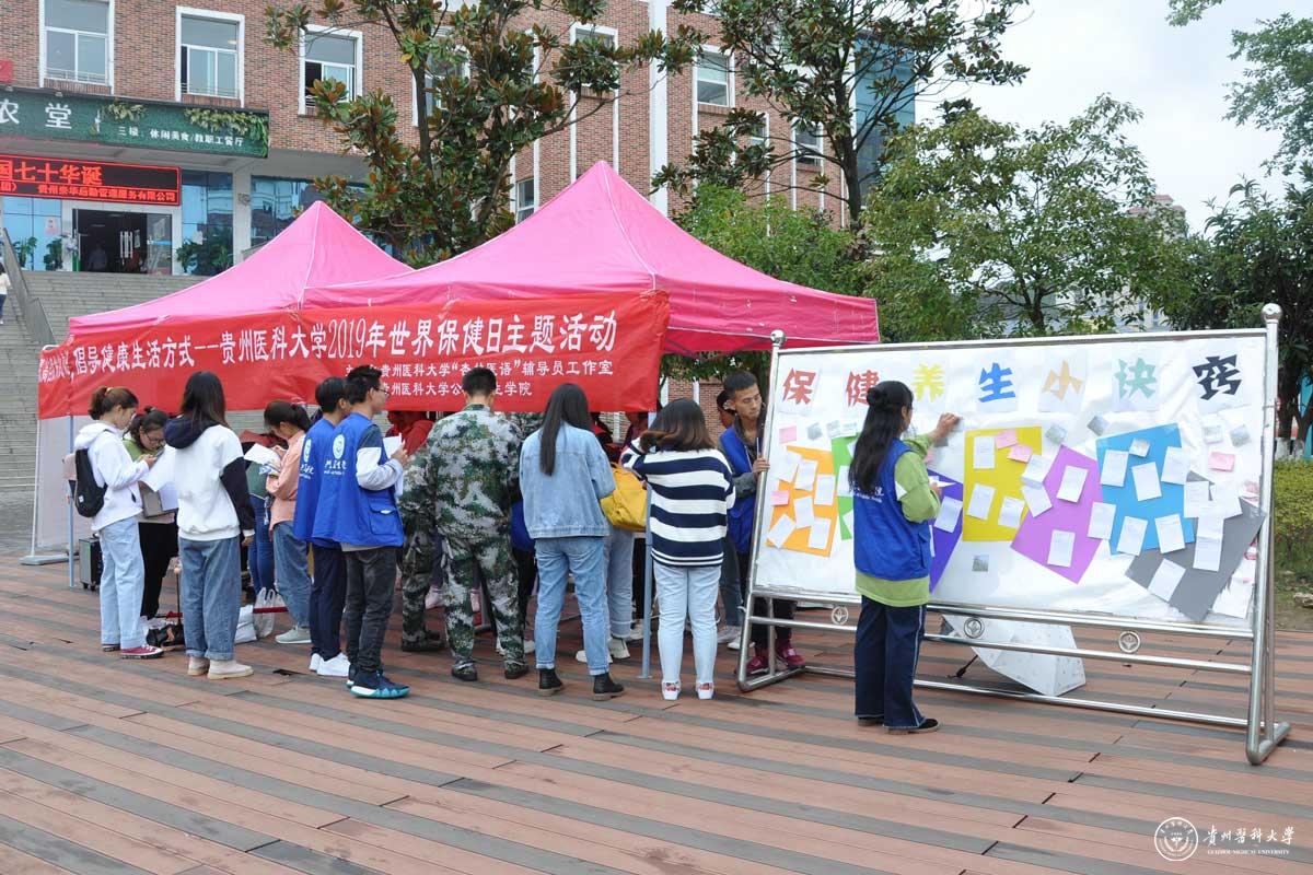 10月13日是世界保健日,万象城官网“杏林医语”辅导员工作室“中国健康”实践行动10月主题活动在南校区一食堂门口举行,此次活动由公共卫生学院承办。
